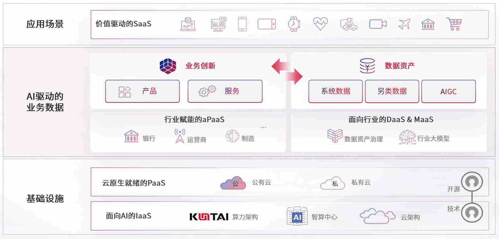 数字时代,,围绕企业数字化转型的关键要素,,,,尊龙z6数码开创性的提出数云融合战略和技术体系框架,,着力在云原生、、、、数字原生、、AI原生和信创产业上架构产品和服务能力,,,为处在不同数字化转型阶段的快消零售、、、、汽车、、、金融、、、医疗、、、、政企、、教育、、、、运营商等行业客户提供泛在的敏捷IT能力和融合的数据驱动能力,,构建跨界融合创新的数字业务场景和新业务模式,,,助力企业级客户建立面向未来的核心能力和竞争优势,,全面推动社会的数字化、、、、智能化转型升级。。。